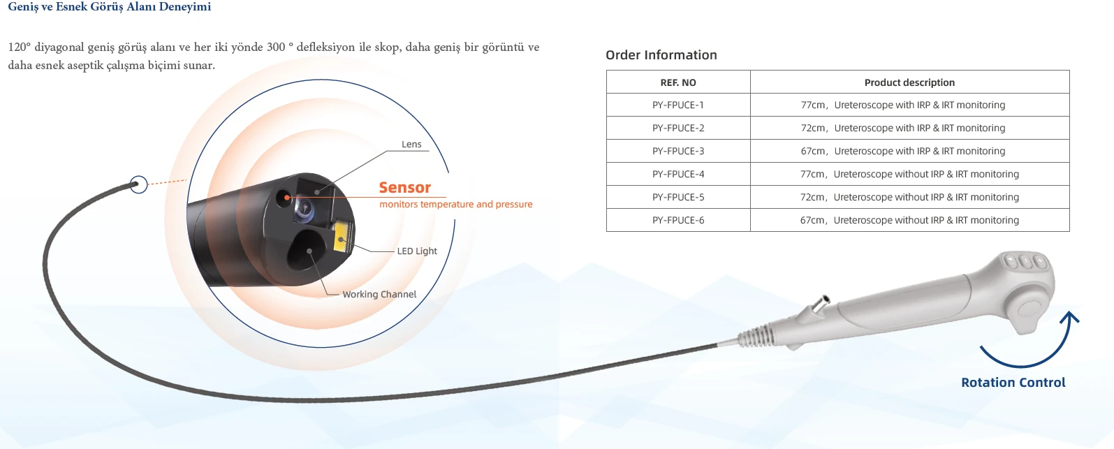 Böbrekleri ve idrar torbasını birbirine bağlayan 4 mm iç çapına sahip silindir şeklindeki tüpe ‘’üreter’’ adı verilirken, üretere endoskopik (kapalı yöntemle) olarak girme işlemi ise üreteroskopi (URS) olarak tanımlanmaktadır. Üreteroskopi, idrar yollarında yer alan küçük ve orta ebattaki böbrek taşlarının tedavisi için tercih edilen yöntem olarak ön plana çıkmaktadır.Üreteroskopi işlemi, üreter adı verilen tüpte yer alan darlık, taş ve tümörlerin teşhis ve tedavisi için uygulanmaktadır. Taş tedavisi söz konusu olduğunda cihazın içinden taş kırma ve tutma aletleri geçerken, darlık tedavisi söz konusu olduğunda genişletmeye yarayan balon ve aletler geçmektedir. Ayrıca tümör tedavisi gündeme geldiğinde, biyopsi ve temizleme aletleri cihazın içinden geçmekte, her bir yöntem için değişik enerji metotları bulunmaktadır.INT Medical üretmiş olduğu üreteroskop ta ısı ve basınç sensörünü aynı anda doktorlarımızın kullanımına sunarak tedavi etkinliğine büyük katkıda bulunmuştur.