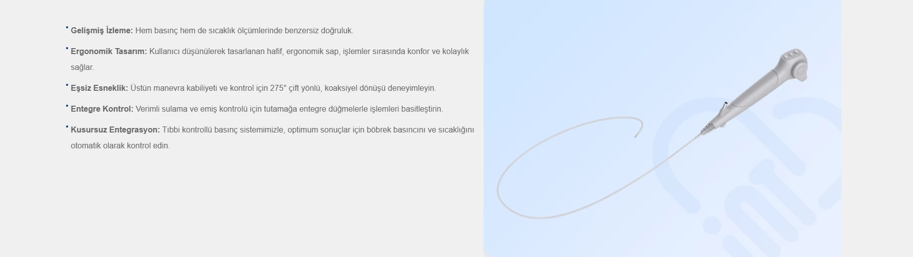 Böbrekleri ve idrar torbasını birbirine bağlayan 4 mm iç çapına sahip silindir şeklindeki tüpe ‘’üreter’’ adı verilirken, üretere endoskopik (kapalı yöntemle) olarak girme işlemi ise üreteroskopi (URS) olarak tanımlanmaktadır. Üreteroskopi, idrar yollarında yer alan küçük ve orta ebattaki böbrek taşlarının tedavisi için tercih edilen yöntem olarak ön plana çıkmaktadır.Üreteroskopi işlemi, üreter adı verilen tüpte yer alan darlık, taş ve tümörlerin teşhis ve tedavisi için uygulanmaktadır. Taş tedavisi söz konusu olduğunda cihazın içinden taş kırma ve tutma aletleri geçerken, darlık tedavisi söz konusu olduğunda genişletmeye yarayan balon ve aletler geçmektedir. Ayrıca tümör tedavisi gündeme geldiğinde, biyopsi ve temizleme aletleri cihazın içinden geçmekte, her bir yöntem için değişik enerji metotları bulunmaktadır.INT Medical üretmiş olduğu üreteroskop ta ısı ve basınç sensörünü aynı anda doktorlarımızın kullanımına sunarak tedavi etkinliğine büyük katkıda bulunmuştur.